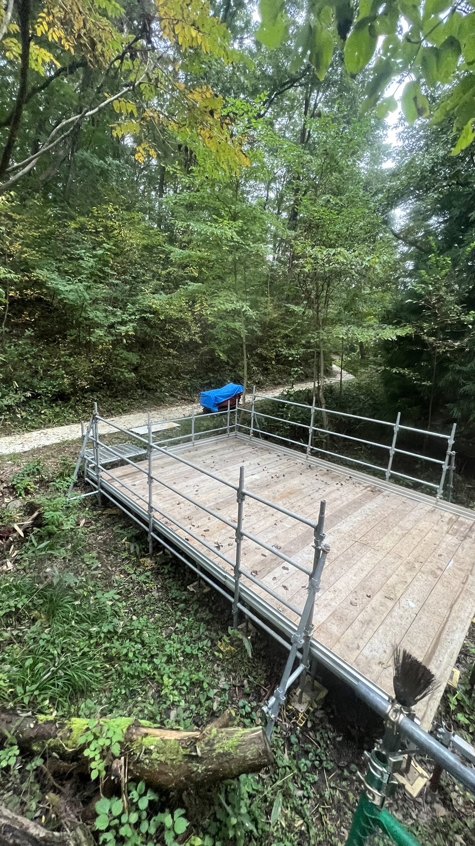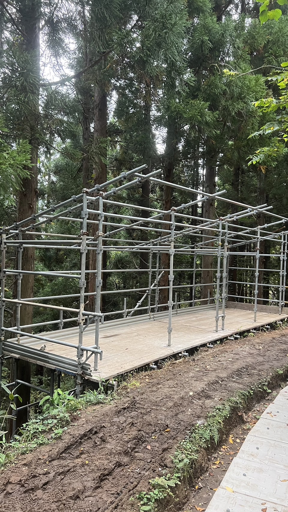 今回は法面足場の組立工事を行いました。やはり足元が悪く少し苦労しましたが、材料の受渡しをしやすくする …