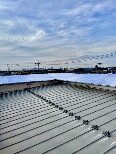 石川県小松市で外壁リフォーム一式→足場組立工事、塗装工事、コーキング工事を行いました。今回の現場は建物の形がスタイリッシュで庇がほとんど無い物件でしたので、急な雨でも対応出来る様に防炎シートによる仮設の屋根工事も一緒に行いました。