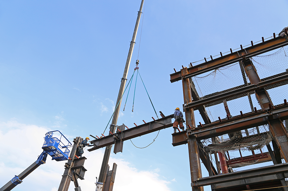 鉄骨を組み立て、建物の骨組み部分を作る工事を行ないます。鉄骨が歪んでいると建物全体が傾いてしまうため、寸分の狂いもなく組み立てられるよう細心の注意を払って作業をしています。鉄骨同士の固定にはボルトやリベットを使用します。接合部分にズレや遊びが生じないようしっかりと締め上げます。建物の荷重に耐え、長期にわたって強度を保ち続けると同時に、美しいデザインを表現できる鉄骨をご提供します。